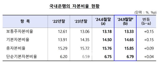 금감원은 “현재 모든 국내은행이 자본규제비율을 크게 상회하는 등 양호한 수준”며 “국내은행의 자본비율은 위험가중자산 증가세 둔화 및 견조한 이익 시현 등에 따른 자본 증가로 전분기말 대비 상승했다”고 말했다.