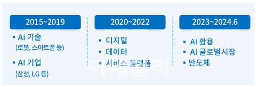 SGI가 토픽모델링(텍스트에 나타나는 단어들을 분해하고, 특정 단어의 출현빈도를 계산) 기법을 사용하여 AI 관련 이슈의 변화를 살펴본 결과, AI 뉴스 주제는 일정 기간 지속성을 가지면서 변화해왔다. 보고서에 따르면 2015~2020년에는 AI 기술과 관련 기업 관련 논의가 진행됐다. 이후 2020~2022년에는 디지털화와 데이터, AI 서비스 플랫폼에 대한 주제에 이어 2023년부터는 AI의 활용과 글로벌 시장, 반도체 관련 주제들이 주요 이슈로 등장했다. 이는 AI 관련 논의가 본격화된 2015년 이후 주요 관심이 기술적 이슈에서 시장과 생산성 등으로 변화되고 있는 것으로 해석된다.
