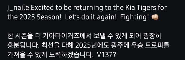 네일은 "한 시즌을 더 기아타이거즈에서 보낼 수 있게 되어 굉장히 흥분됩니다"라며 "최선을 다해 2025년에도 광주에 우승 트로피를 가져올 수 있게 노력하겠습니다"라고 썼다.