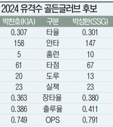 올 시즌 KBO리그 골든글러브 유격수 포지션은 최대 격전지로 분류된다. 최근 2년 연속 수상한 오지환(34·LG 트윈스)이 부진한 틈을 타 박찬호와 박성한(26·SSG 랜더스)이 2파전 구도를 만들었기 때문이다. 두 선수 모두 규정타석 타율 3할을 해냈고 실책 수가 23개로 같다. 개인 성적은 두 자릿수 홈런(10개·박찬호 5개)까지 기록한 박성한의 소폭 우위인데 박찬호는 통합우승을 이끌었다는 점에서 어느 정도의 '우승 프리미엄'이 예상된다. 상황이 이렇다 보니 여론도 팽팽하다.