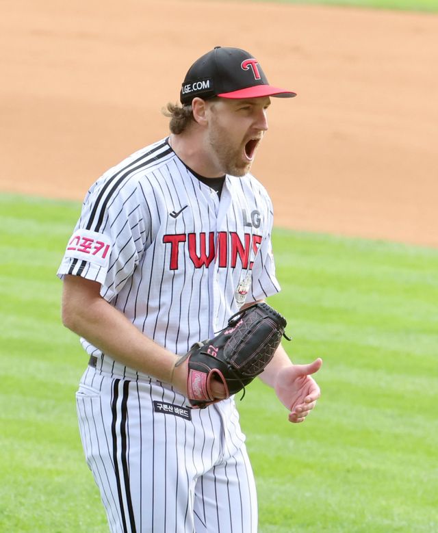 19일 오후 잠실야구장에서 열린 삼성라이온즈와 LG트윈스의 2024 신한쏠뱅크 KBO포스트시즌 플레이오프 4차전. LG 선발 엔스가 6회 삼성 디아즈를 삼진으로 돌려세우고 이닝을 종료하며 기뻐하고 있다. 잠실=정시종 기자 capa@edaily.co.kr /2024.10.19.