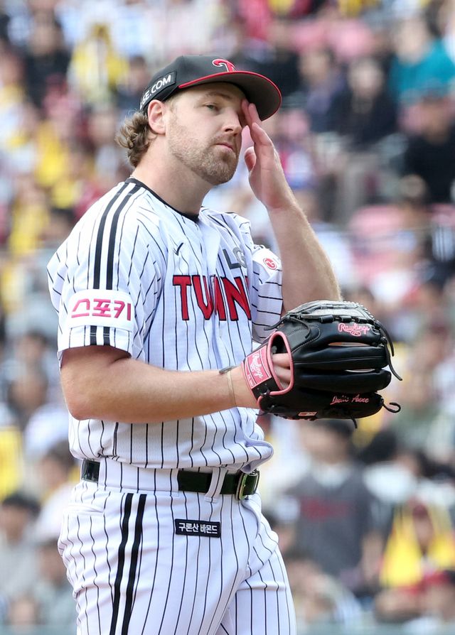 2024 프로야구 KBO 포스트시즌 LG트윈스와 삼성라이온즈의 플레이오프(PO) 4차전 경기가 19일 오후 서울 잠실야구장에서 열렸다. 4회초 2사 박병호를 풀카운트 끝에 볼넷으로 내보낸 엔스가 아쉬워하고 있다. 잠실=김민규 기자 mgkim1@edaily.co.kr /2024.10.19/