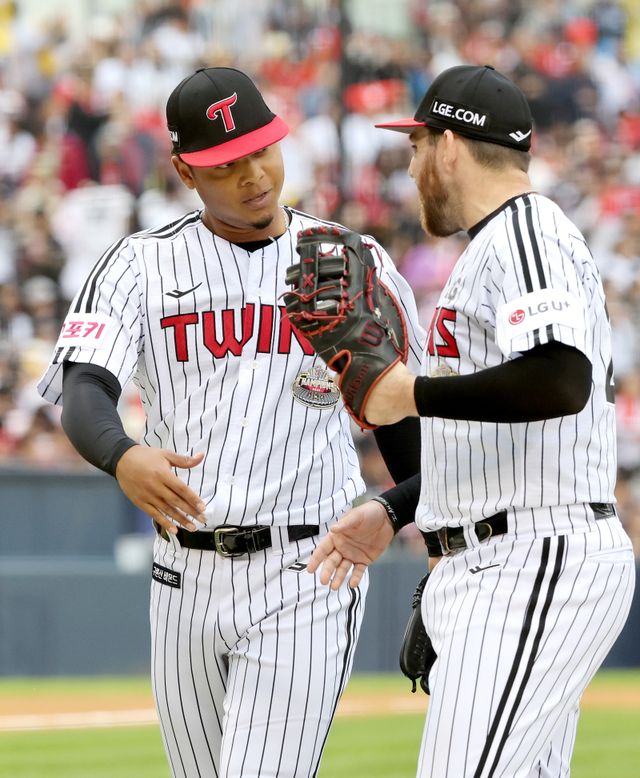2024 프로야구 KBO 포스트시즌 LG트윈스와 kt위즈의 준플레이오프(준PO) 2차전 경기가 6일 오후 서울 잠실야구장에서 열렸다. 6회초 2사 1,2루 황재균을 삼진으로 처리한 에르난데스가 마운드를 내려가며 오스틴의 축하를 받고 있다. 잠실=김민규 기자 mgkim1@edaily.co.kr /2024.10.06/