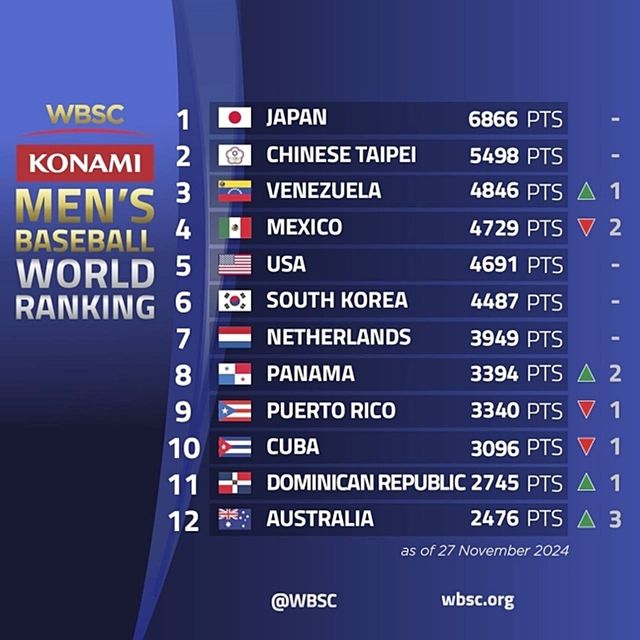 한국 야구 대표팀은 최근 열린 WBSC 프리미어12 2024에서 슈퍼라운드 진출에 실패하며 807점을 얻는 데 그쳤다. 반면 해당 대회에서 준우승을 차지한 일본은 1102점을 추가해 총점 6866점으로 남자 야구 세계 랭킹 1위를 유지했다.