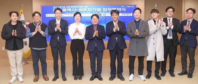 이날 협약식에는 강기정 시장을 비롯해 더블유에이아이 이진행 대표이사, 바이오브레인 김기성 대표이사, 아파유 신승호 대표이사, 앰플랩 김진영 대표이사, 일리오 오태근 대표이사, 토마스톤 이재영 대표이사, 투비유니콘 윤진욱 대표이사, 하마다랩스 이득기 CTO 등이 참석했다.