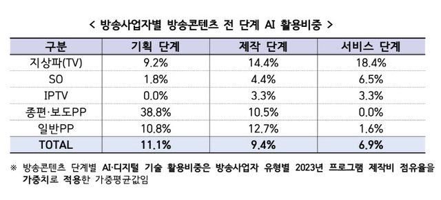 조사 결과에 따르면 2023년 전체 방송콘텐츠 중 AI 기술을 활용한 방송콘텐츠 비중은 기획단계에서 11.1%, 제작단계에서 9.4%, 서비스단계에서 6.9%로 조사되었다. 이는 방송사들이 2023년 제작·송출한 전체 방송콘텐츠 10편 중 평균 1편 정도는 기획단계와 제작단계에서 AI를 적용하였고, 서비스단계에서는 0.7편 정도가 AI 기술을 적용했다는 것을 의미한다.