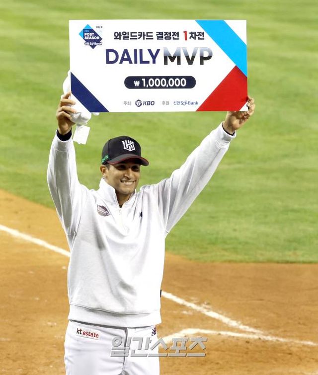 2일 오후 잠실구장에서 열린 KT 위즈와 두 산베어스의 2024신한쏠뱅크 KBO포스트시즌 와일드카드 결정1차전. KT가 4-0 승리했다. 경기 종료 후 데일리 MVP에 선정된 쿠에바스가 기뻐하고 있다. 잠실=정시종 기자/2024.10.02.
