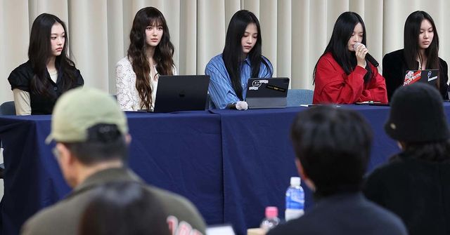 걸그룹 뉴진스가 28일 오후 서울 강남구 스페이스쉐어 삼성역센터에서 열린 전속계약 해지 관련 기자회견에 참석해 있다. 왼쪽부터 해린, 다니엘, 민지, 하니, 혜인. / 뉴스1(공동취재)