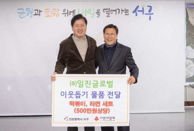 [파이낸셜경제=김영란 기자] 인천 서구는 11월 28일, ㈜일진글로벌(대표이사 조병상)로부터 라면 및 떡볶이세트(455만원 상당)를 전달받았다.