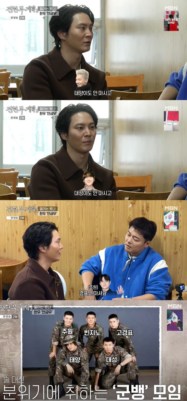 전현무는 "빅뱅 친구들이나..."라고 물었고, 주원은 "안 마신다. 태양이도 거의 안 마시고 대성이도 안 마신다. 경표만 마신다"며 "저희랑 있으면 밥만 먹는다"고 전했다.
