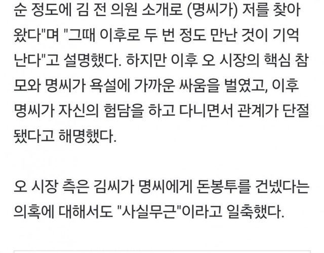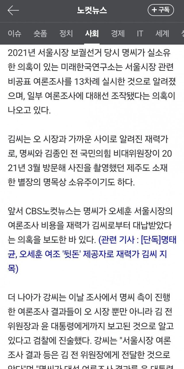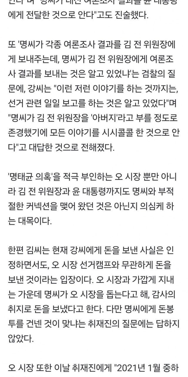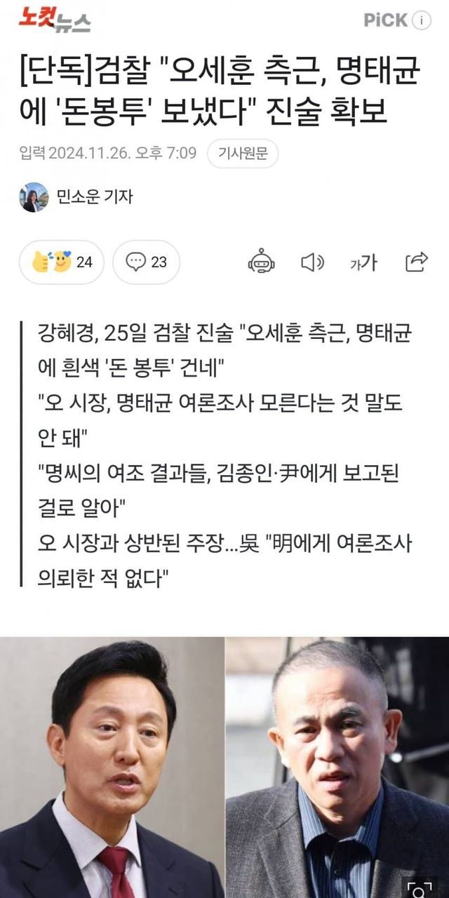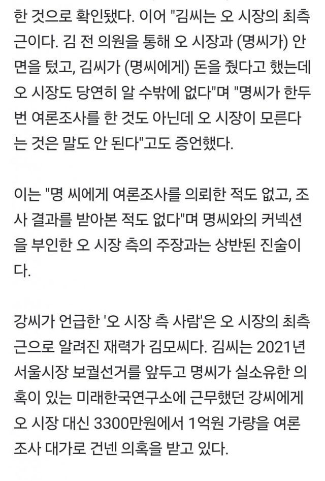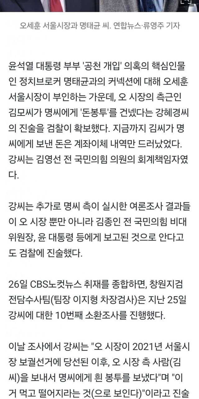 윤석열 대통령 부부 ‘공천 개입’ 의혹의 핵심인물인 정치브로커 명태균과의 커넥션에 대해 오세훈 서울시장이 부인하는 가운데, 오 시장의 측근인 김모씨가 명씨에게 ‘돈봉투’를 건넸다는 강혜경씨의 진술을 검찰이 확보했다.