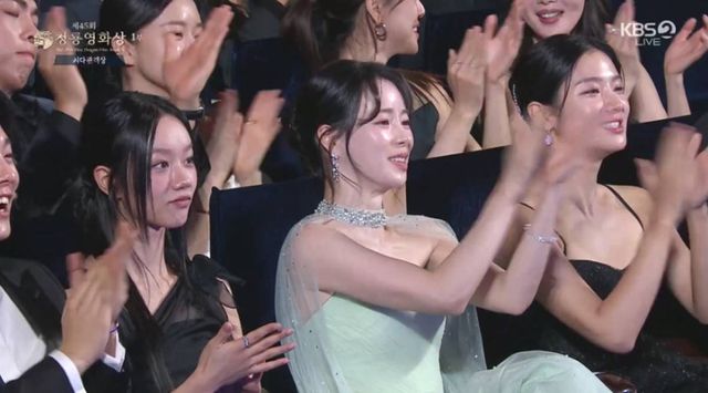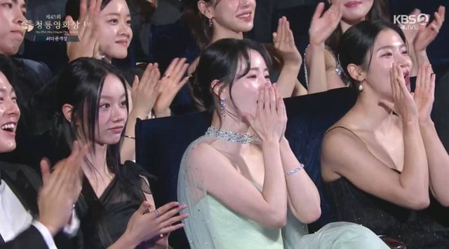 무대에 오른 정우성은 굳은 표정으로 마이크 앞에 섰다. 그가 인사를 건네자마자 관객석에서는 열띤 박수갈채와 환호성이 터져 나왔다. 일순간 카메라에 일부 배우들의 모습이 잡히기도 했는데, 임지연과 박주현, 김고은 등은 열띤 환호를 보냈다. 반면 혜리는 박수도 거의 치지 않는 모습을 보였다.