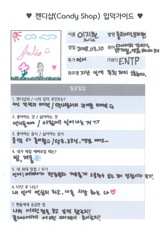 줄리아는 "막내로서 귀여운 매력"을 개인 '입덕' 포인트로 적었어요. 얼굴만 봐도 너무 귀엽고 사랑스러워서 매력이 철철 넘치는 줄리아인데, 사실은 집에서 '장녀'라고 해요. 또 특별히 꾸미기를 좋아하는 편이 아니라 언니들 옷만 골라 입어도 행복하다는 세상 순수한 막내더라고요.