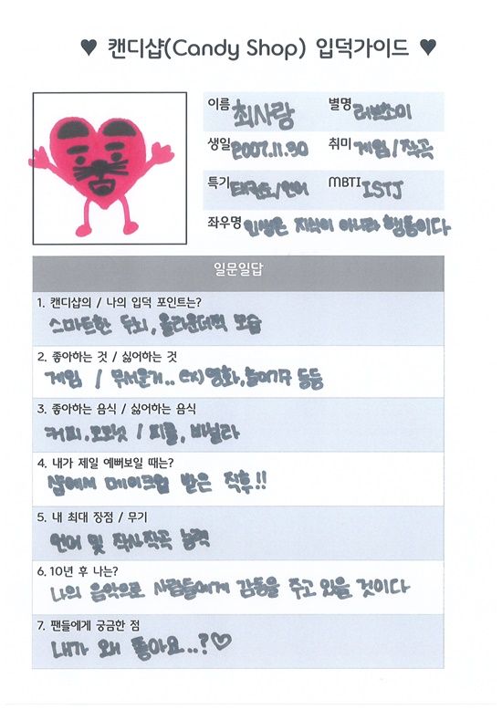첫 번째 주자, 사랑은 자신의 '입덕' 포인트를 당당하게 적었는데요. 스스로에 대한 확신과 신념이 가득한 사랑! 스스로 생각하는 '입덕' 포인트를 "스마트한 두뇌"와 "올라운더적인 모습"이라고 꼽았어요.