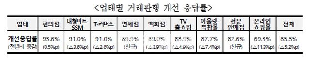 업태별로 보면 신규 조사 업태(면세점, 전문판매점)를 제외한 모든 업태(편의점, 대형마트·SSM, T-커머스, 백화점, TV홈쇼핑, 아울렛·복합몰, 온라인쇼핑몰)에서 개선 응답률이 1년 전보다 감소했다. 온라인쇼핑몰은 69.3%로 전년보다 11.3%포인트나 줄었다. 이는 조사 업태 중 가장 낮은 수준이다.