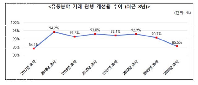1일 공정거래위원회가 발표한 ‘2024년 유통분야 거래 관행 서면실태 조사’ 결과 대규모유통업체의 거래 관행이 전년에 비해 개선됐다고 응답한 납품업체 비율은 85.5%로 전년(90.7%)보다 5.2%포인트 감소했다. 이는 지난 2017년(84.1%) 이후 7년 만에 가장 낮은 수준이다.