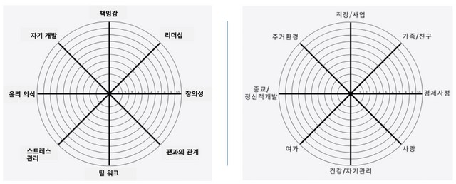 워크 에식, 직업 윤리는 여러 모습을 보인다. 어느 한쪽만으로 좋고 나쁘고를 판단하기 어렵다. 균형 잡힌 판단을 위해 8개 항목으로 야구 선수의 워크 에식 평가표 (왼쪽)를 제안한다. 코칭 상담에서 많이 쓰는 ‘라이프 밸런스 휠(life balance wheel, 오른쪽)’에서 착안했다. 삶의 의미, 변화시키고 싶은 영역을 발견할 때 요긴하다.