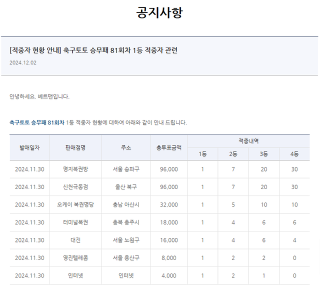 1등 적중 7건·적중금 13억...축구토토 승무패 81회차 적중결과 발표