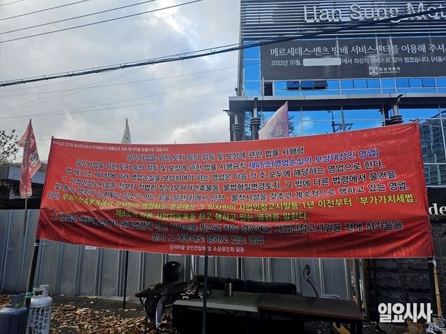 성뒤마을상인연합회는 남부순환로(8차로)를 따라 설치한 펜스에 ‘SH는 들어라! 현실적 보상 안 하면 죽어도 이주 못한다!’ ‘서울시와 SH는 우리 소상공인들을 다 불태워 죽일 셈이냐!’라고 적힌 새빨간 현수막을 내걸고 서울주택공사의 제안에 강력 반발하고 있다.