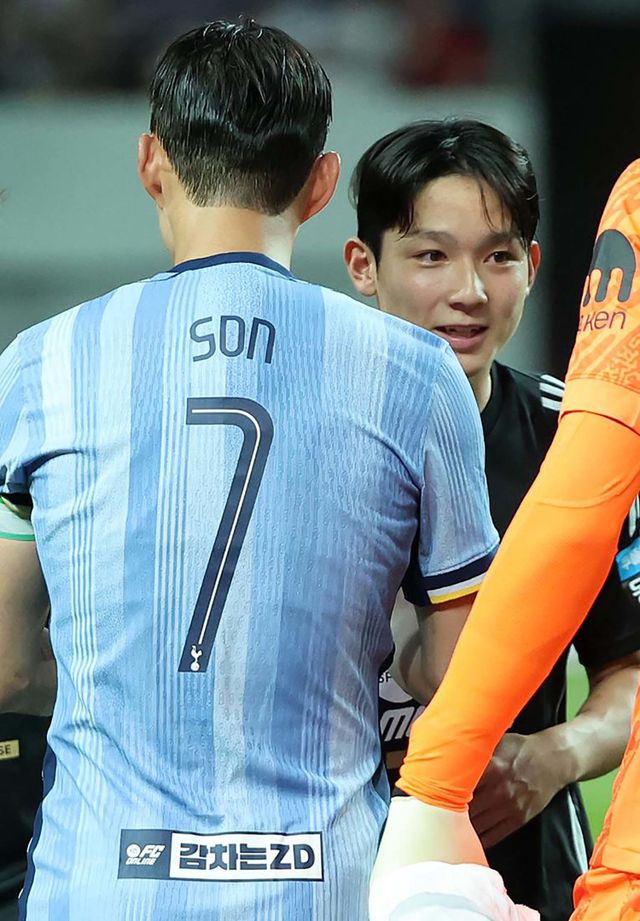 7월 31일 오후 서울 마포구 상암동 서울월드컵경기장에서 열린 쿠팡플레이 시리즈 1차전 토트넘 홋스퍼와 팀 K리그의 경기를 앞두고 팀 K리그 양민혁이 토트넘 손흥민과 인사를 나누고 있다. / 뉴스1