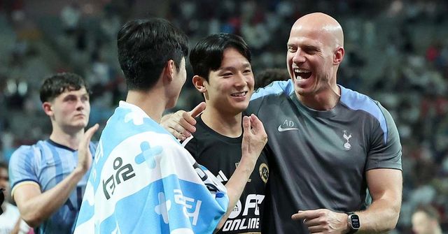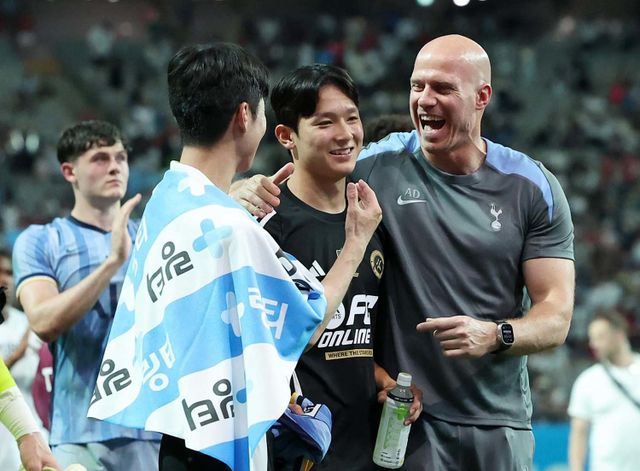 7월 31일 오후 서울 마포구 상암동 서울월드컵경기장에서 열린 쿠팡플레이 시리즈 1차전 토트넘 홋스퍼와 팀 K리그의 경기에서 3대4 패배를 기록한 팀 K리그의 양민혁이 경기 후 토트넘 코칭스테프와 웃으며 대화를 나누고 있다. / 뉴스1