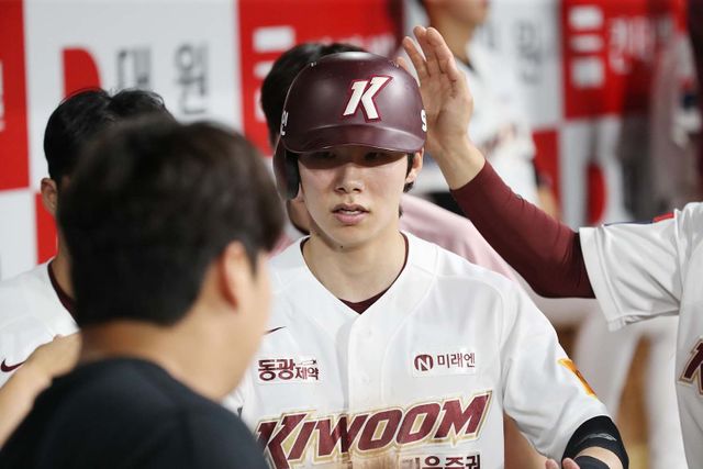 7월 3일 서울 구로구 고척스카이돔에서 열린 프로야구 2024 신한은행 SOL뱅크 KBO리그 LG 트윈스와 키움 히어로즈의 경기 3회말 1사 2루 상황 키움 송성문의 1타점 적시타때 득점에 성공한 김혜성이 더그아웃으로 들어오고 있다. / 뉴스1
