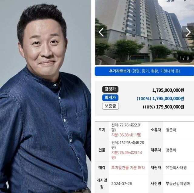 이날 주류 유통업체가 2억 3,293만 812원을 못 받았다며 정준하 소유의 서울 강남구 삼성동 중앙하이츠빌리지 아파트(전용 152㎡)를 경매에 넘긴 사실이 알려졌습니다.