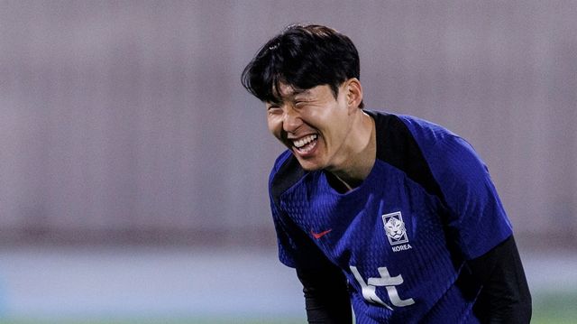 한국 축구대표팀의 주장 손흥민이 지난달 12일 오후(현지 시각) 쿠웨이트 압둘라 알 칼리파 스타디움에서 열린 팀 훈련에서 동료들과 훈련하다 활짝 웃고 있다. / 연합뉴스