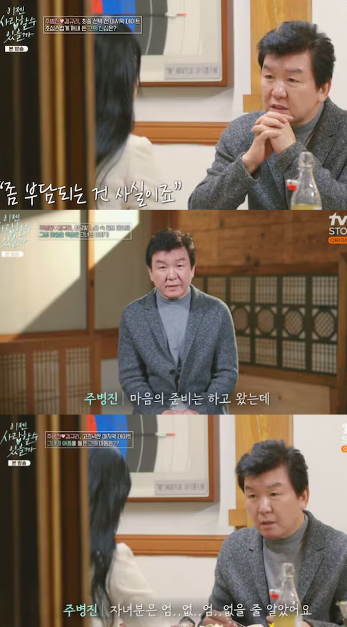 주병진(66)이 세 번째 맞선녀 김규리(54)와의 만남에서 그녀의 고백을 듣고 당황한 모습을 보였다.