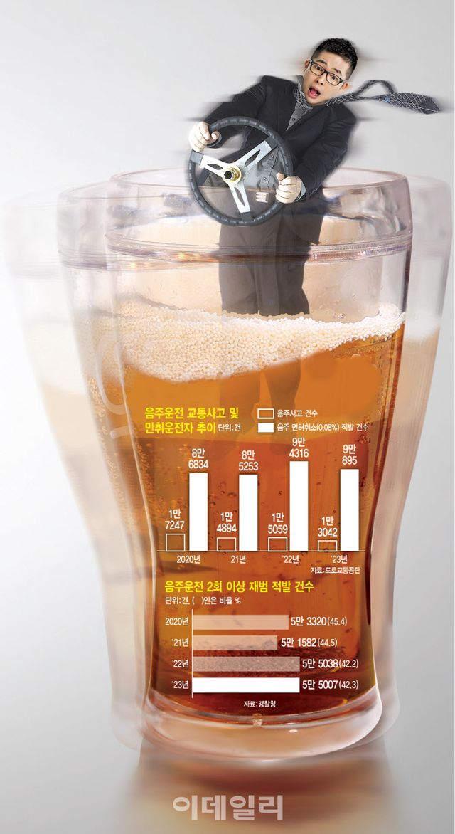 한병도 더불어민주당 의원이 경찰청 제출 자료를 분석한 결과 최근 5년간 전체 음주운전 교통사고 7만5950건 중 3만2877건(43.3%)은 음주운전 적발 이력이 있는 음주전력자가 일으킨 것으로 나타났다. 사고를 내고도 음주운전에 대한 경각심이 부족했다는 뜻이다.