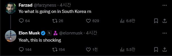 3일(현지시간) 머스크 CEO는 소셜미디어(SNS) 엑스(X, 구 트위터)에 한국 국회에서 ‘비상계엄 해제 요구안’이 190표로 가결됐다는 소식을 담은 게시글을 공유하면서 “놀랍다”(WOW)는 글을 덧붙였다.