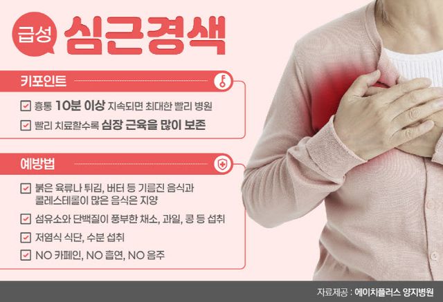 급성 심근경색은 초기 사망률이 40%로 병원으로 이동해 치료해도 병원 내 사망률이 5~10%에 이른다.급성 심근경색의 대표적인 전조증상은 흉통이다. 가슴을 조이거나 쥐어짜는 듯한 통증이 나타나는데, 통증이 10분 이상 지속되면 참지 말고 최대한 빨리 병원을 찾아야 한다.