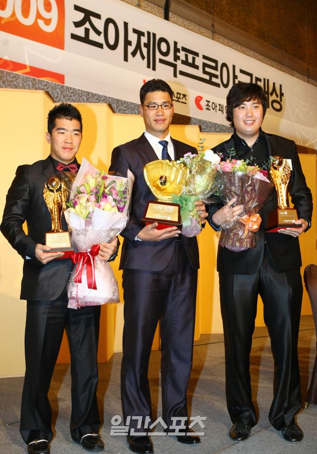 2009년에 열린 조아제약 프로야구 대상 시상식에서 수상자들이 기념사진을 찍고 있다. 왼쪽부터 최고타자상 정근우, 대상 김상현, 최고투수상 조정훈이다. IS 포토