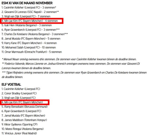 퀴빈 켈러허(리버풀), 지오반니 디로렌초(나폴리), 버질 판데이크(리버풀), 김민재, 이삭 히엔(아탈란타), 라이언 그라벤베르흐(리버풀), 샤를 데케텔라에르(아탈란타), 자말 무시알라(바이에른 뮌헨), 해리 케인(바이에른 뮌헨), 모하메드 살라(리버풀), 오마르 마르무쉬(아인라흐트 프랑크푸르트)가 ESM 11월 이달의 팀 선정의 영예를 안았다.