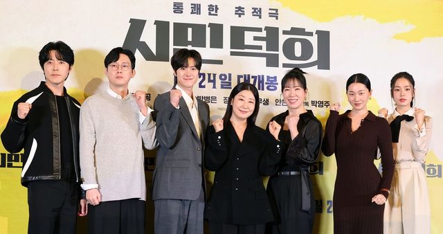 배우 이무생(왼쪽부터), 박병은, 공명, 라미란, 염혜란, 장윤주, 안은진이 지난 1월 11일 오후 서울 용산구 CGV용산아이파크몰에서 열린 영화 ‘시민덕희’ 언론시사회에 참석해 기념 촬영을 하고 있다. / 뉴스1