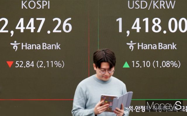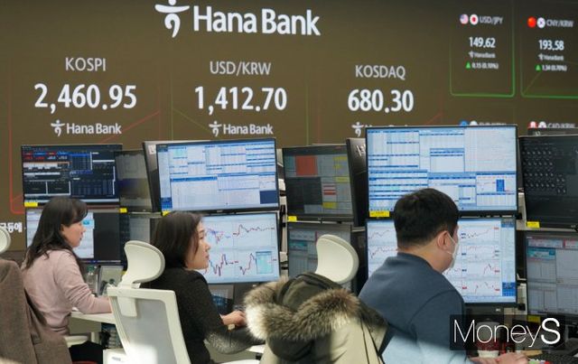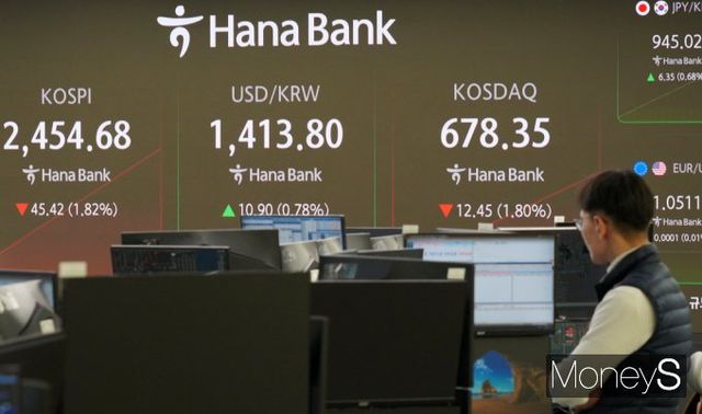윤석열 대통령이 한밤중 비상계엄을 선언했지만, 국회 의결로 계엄이 해제된 4일 서울 중구 을지로 하나은행 본점 딜링룸 전광판에 이날 거래를 시작한 코스피 원/달러 환율, 코스닥 지수가 표시돼 있다.