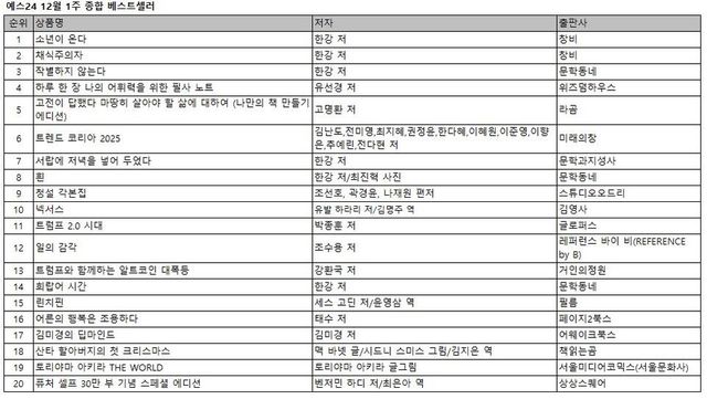 1위는 한강 작가의 소설로 압도적인 인기를 기록했다. 노벨문학상 시상식을 앞두고 있는 한강의 작품들이 베스트셀러 순위에 다수 포진하며 독자들의 관심을 모았다.