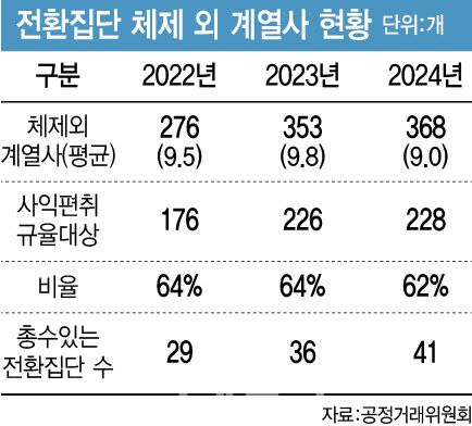 전환집단 체제 외 계열사는 꾸준히 증가하는 추세다. 체제 외 계열사의 사익 편취 규율 대상은 △2019년 170개 중 81개 △2020년 161개 중 80개 △2021년 225개 중 96개 △2022년 276개 중 176개 △2023년 353개 중 226개로 집계된 바 있다.