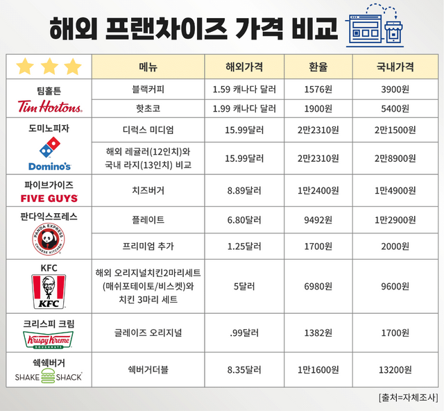 국내 진출한 해외 프랜차이즈 가격은 현지인들도 놀라는 수준이다. 해외 프랜차이즈 대표 메뉴들을 현지 달러로 다시 역산해 보니 △팀 홀튼 블랙커피는 3.91캐나다 달러 △판다익스프레스 플레이트 9.24달러 △크리스피 크림 오리지널 글레이즈 1.25달러 △KFC 치킨 3조각세트 8.7달러 △파이브가이즈 치즈버거 단품 10.7달러 등이다.