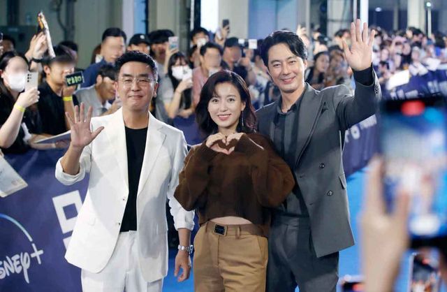박인제 감독(왼쪽부터)과 강풀 작가, 배우 김희원, 김성균, 차태현, 류승룡, 한효주, 조인성, 이정하, 고윤정, 김도훈이 지난해 8월 3일 서울 성동구 S팩토리에서 열린 디즈니+ 새 오리지널 시리즈 '무빙' 블루 카펫 행사에서 포즈를 취하고 있다. / 뉴스1
