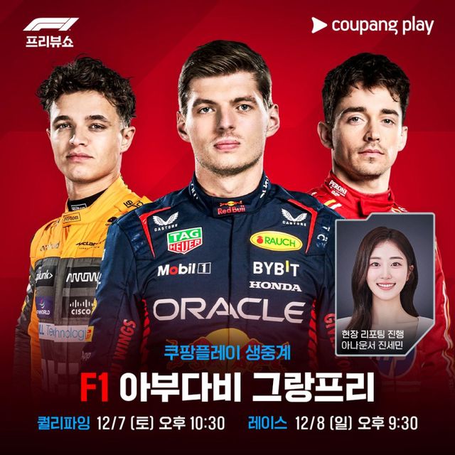 OTT 쿠팡플레이는 "6일 오후 6시 20분 연습 주행인 3회의 프랙티스를 시작으로 7일 오후 10시 30분 퀄리파잉, 8일 오후 9시 30분 레이스까지 풀 패키지 중계와 진세민 아나운서의 현장 리포팅을 통해 아부다비 현장의 뜨거운 열기와 생동감을 국내 팬들에게 전할 예정"DLFKRJ
