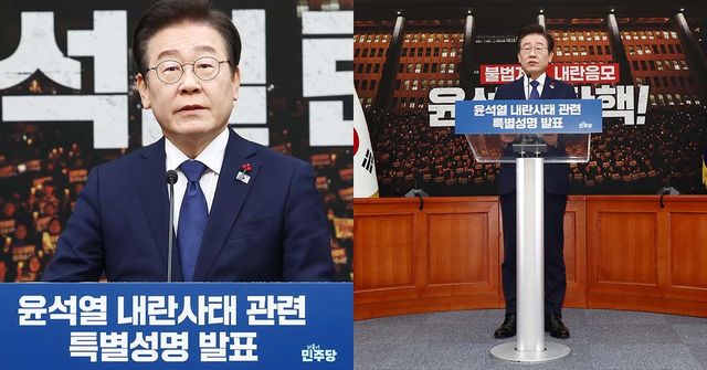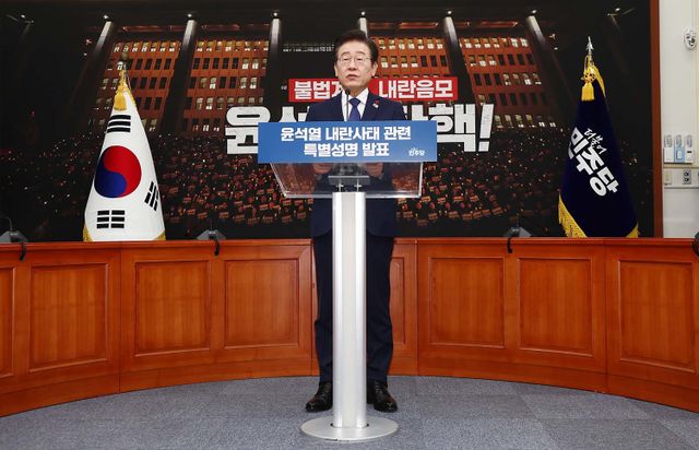 이재명 더불어민주당 대표가 6일 서울 여의도 국회에서 윤석열 내란사태 관련 특별성명을 발표하고 있다. / 뉴스1