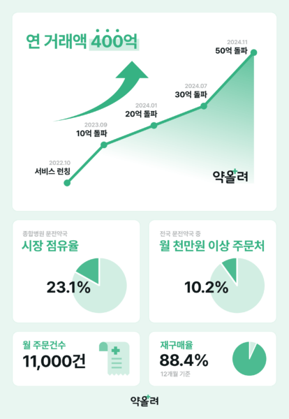 합리적인 반품 보상 정책을 토대로 약올려는 종합병원 문전 약국을 비롯해 총 1900여 개의 약국을 주요 고객사로 확보했으며, 전체 고객사의 월 평균 주문 건 수 1만1000건, 재구매율은 88.4%에 달한다.