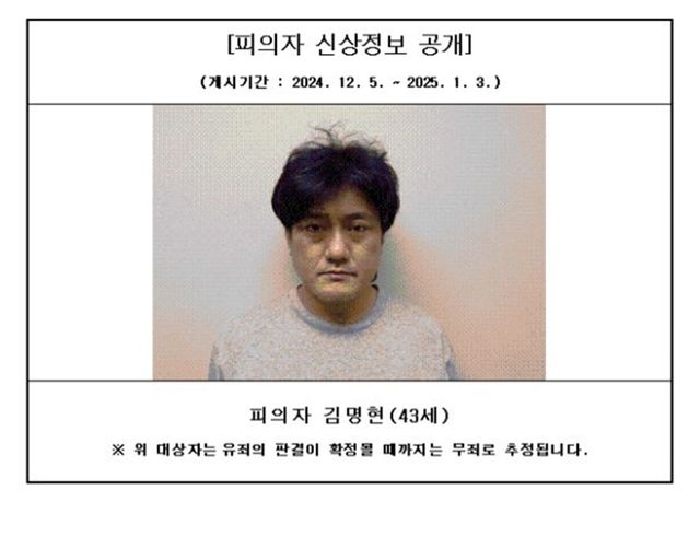 6일 대전지방검찰청에 따르면 김명현의 이름과 나이, 얼굴 사진이 지난 5일 대전지검 서산지청 누리집에 게시됐다. 공개 기간은 다음 달 3일까지다.