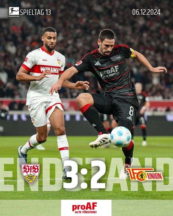 7일(한국시간) 독일 슈투트가르트의 MHP 아레나에서 2024-2025 독일 분데스리가 13라운드를 치른 우니온베를린이 슈투트가르트에 2-3으로 졌다. 우니온베를린은 리그 6경기 연속 무승(2무 4패)으로 11위(승점 16)에 머물렀고, 슈투트가르트는 6위(승점 20)로 올라섰다.