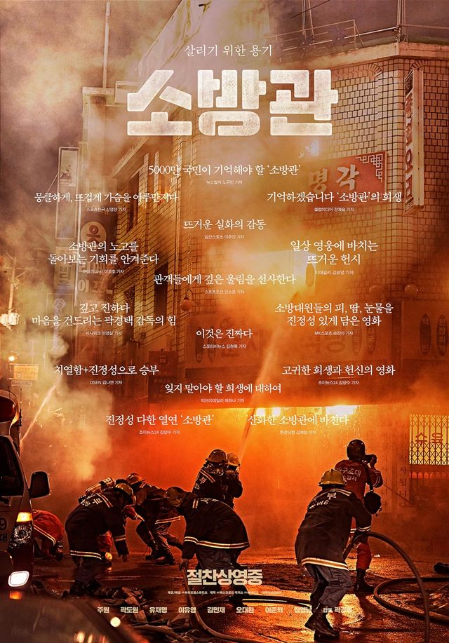 한편 ‘소방관’은 2001년 홍제동 화재 참사 사건 당시 열악한 환경 속에서도 화재 진압과 전원 구조라는 단 하나의 목표를 가지고 투입된 소방관들의 상황을 그린 이야기이다. 배급사 바이포엠스튜디오는 4일 관객들의 티켓 수익금으로 2025년 완공되는 국립소방병원에 기부하는 ‘119원 기부 챌린지’를 시작했다고 밝혔다. 절찬 상영중.