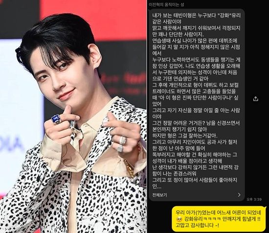 과거 연습생 시절 인연부터 Mnet '프로듀스101' 보컬트레이너로서 함께한 이진혁과의 각별한 관계도 빼놓을 수 없다. 메시지가 너무 길어 '전체보기'를 눌러야 다 확인할 수 있을 정도로, '아이돌티스트' 메시지 중 역대 가장 긴 메시지를 자랑하는 이진혁의 애정 어린 멘트도 살펴보자.