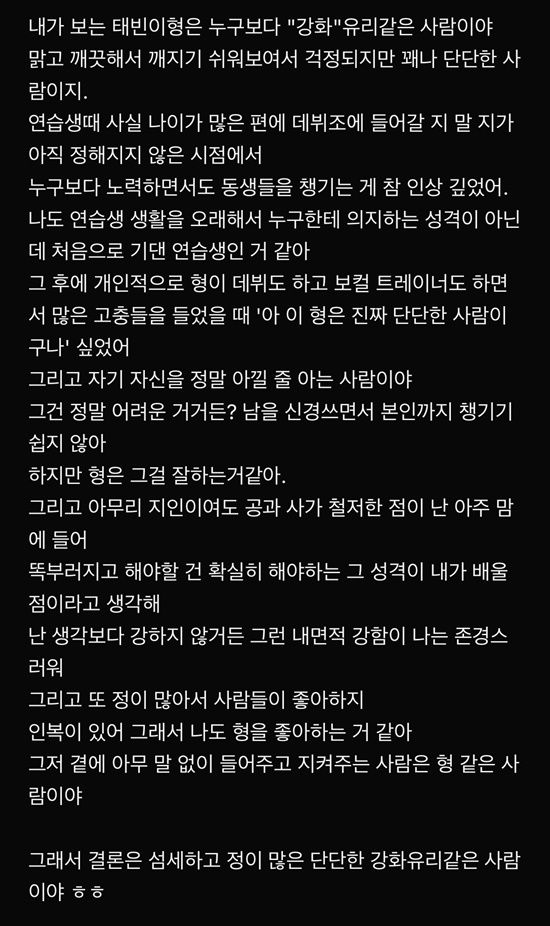 "내가 보는 태빈이 형은 누구보다 '강화 유리'같은 사람이야. 맑고 깨끗해서 깨지기 쉬워 보여 걱정되지만 꽤나 단단한 사람이지. 연습생 때 사실 나이가 많은 편에 데뷔조에 들어갈지 말지 아직 정해지지 않은 시점에서 누구보다 노력하며 동생들을 챙기는 모습이 참 인상깊었어. 나도 연습생 생활을 오래해서 누구한테 의지하는 성격이 아닌데, 처음으로 기댄 연습생인 것 같아.