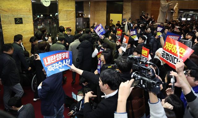 윤석열 대통령 탄핵소추안이 부결된 지난 7일 오후 서울 여의도 국회에서 표결에 불참했던 국민의힘 의원들이 의원총회를 마치고 야당 보좌진의 항의 속에 국회를 나서고 있다 / 뉴스1