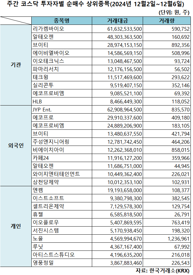기관 '리가켐바이오'·외인 'JYP Ent.'·개인 '엔켐' 1위 [주간 코스닥 순매수- 12월2일~12월6일]